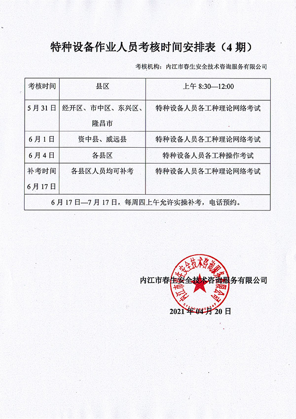 2021年春生公司04期特種設備作業(yè)人員考核時間安排