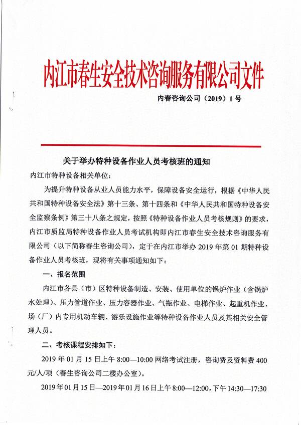 2019年第一期特種設備作業(yè)人員考核培訓班的通知