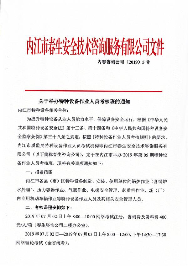 2019年第五期特種設(shè)備作業(yè)人員考核培訓(xùn)班的通知